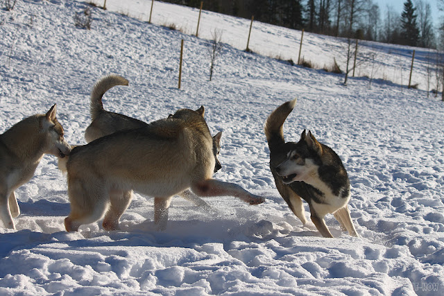 Hetken ehti näyttää alkuviikosta jo huonolta, kun keli oli plussalla ja tihkutti vettä. Pakkaset kuitenkin onneksi palasivat ja vielä saadaan hetki nauttia talvesta ja viime vuosina täällä etelä-Suomessa harvinaiseksi käyneestä hankikannosta. Samalla mainio hetki harjoitella avoimella kentällä ajoa. Johdossa Pave (Fi Ch Mustankallion Bavel) ja Paven pentu Joiku (Vetoava Brighid).